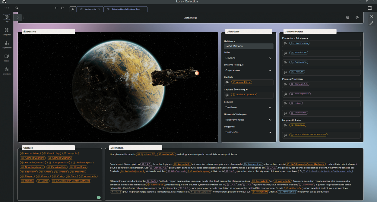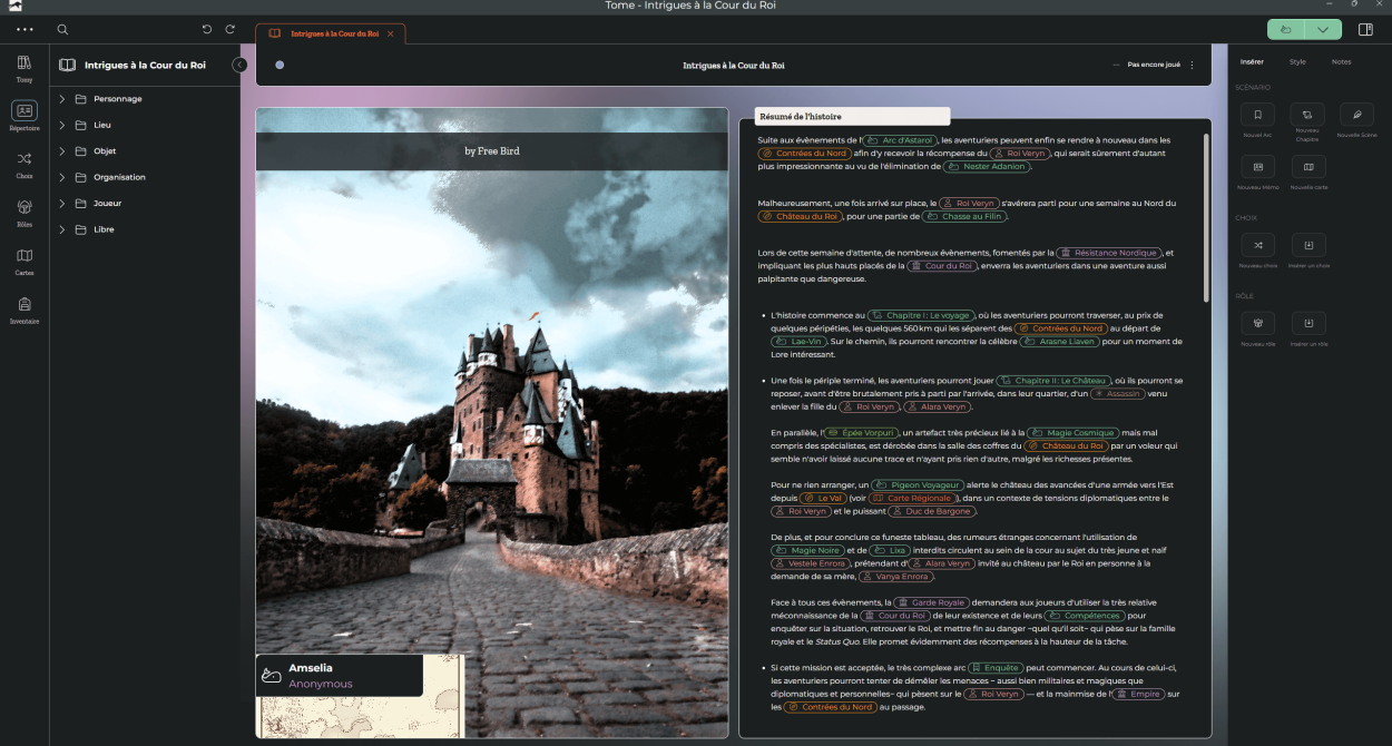 Assurez une parfaite cohérence entre les éléments de votre monde et votre histoire, en liant directement les lieux, personnages et événements.
