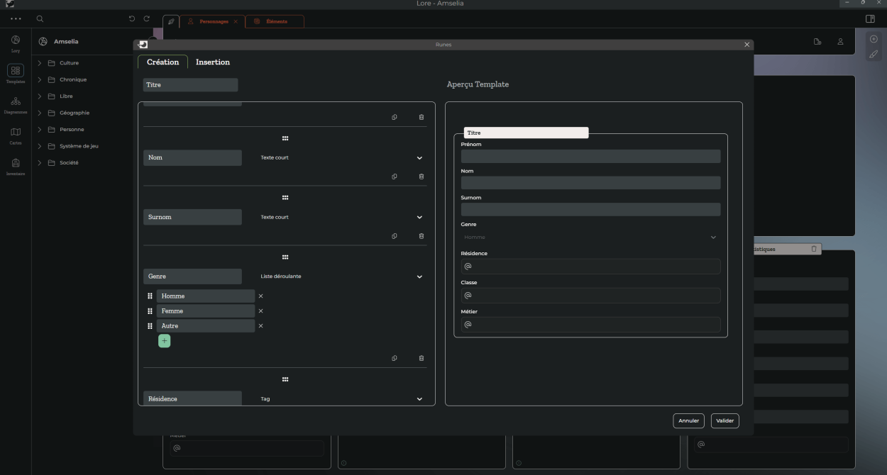 Les templates de Lore ne sont pas de simples suggestions. Ce sont des règles que vous donnez au logiciel. Si vous décidez de réorganiser un template, toutes les pages utilisant ce template s'adaptent en conséquence. Modifiez, améliorez, en toute liberté, sans jamais devoir revenir en arrière.