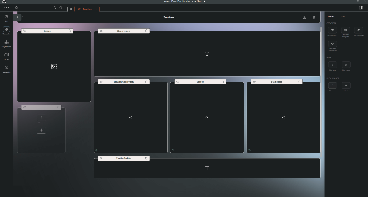 Grâce aux runes, créez un template dans un template pour guider la création de vos pages. Réutilisez-les d'un template à l'autre pour une plus grande cohérence entre les pages de votre monde. Tout est préparé, place à l'imagination !